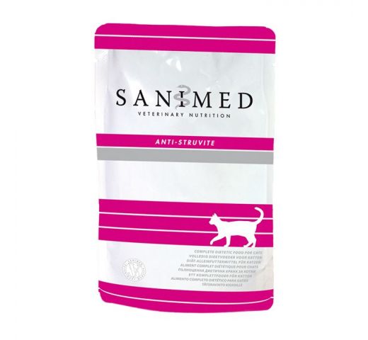 Struvit je jedna od najčešćih vrsta kamena u bešici. Kamen u bešici kod vaše mačke može dovesti do bolova pri mokrenju, učestalog mokrenja u malim količinama, naprezanja pri mokrenju, mokrenja u kući, krvavog urina ili čak nemogućnosti mokrenja. Povećana koncentracija otpadnih proizvoda u krvi može dovesti do toga da se mačka oseća bolesno, što može promeniti njeno ponašanje. Sa smanjenjem kiselosti urina (viši pH), povećava se rizik od stvaranja struvitnog kamena. Niska kiselost (visok pH) urina može biti uzrokovana ishranom ili infekcijom urinarnog trakta. Mačke koje su jednom razvile kamenje u bešici su uglavnom sklone vraćanju kamena u bešiku. Zbog toga je važno preduzeti mere za rastvaranje struvitnog kamena i sprečavanje stvaranja novog kamena. SANIMED Anti-Struvite pomaže u rastvaranju struvitnih kamenaca i smanjenju ponovljene formacije struvitnih kamenaca. Ova dijeta se može dati doživotno. SANIMED Anti-Struvite je takođe dostupan kao suva hrana (zrnaca). Starosna dob - Sve rase: od 1 godine