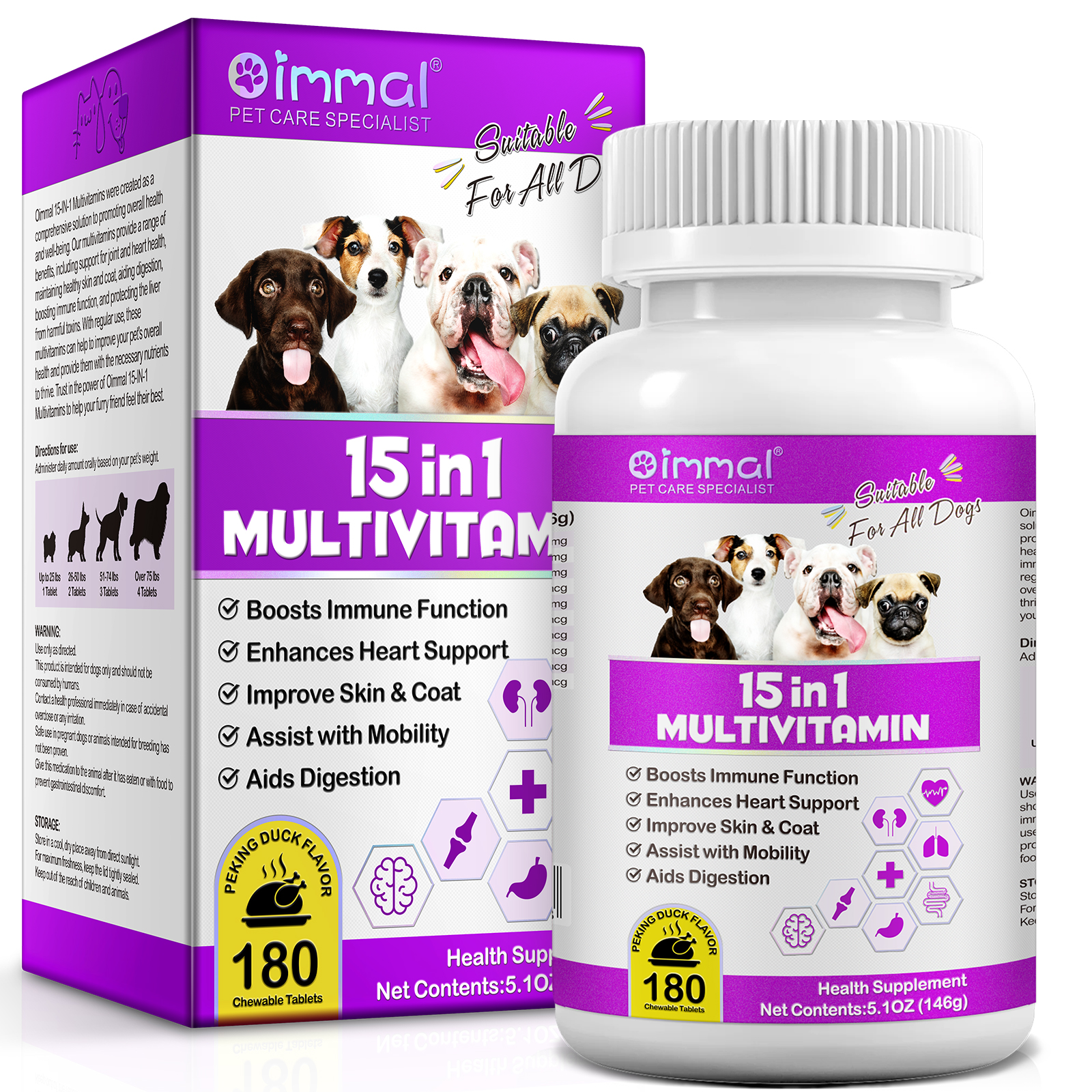 Opis proizvoda: Sveobuhvatne zdravstvene prednosti: Mešavina od 15 esencijalnih vitamina i minerala podržava svaki aspekt zdravlja vašeg psa, od pokretljivosti zglobova do kardiovaskularnog zdravlja. Podrška za zdravlje zglobova: Uključuje glukozamin, hondroitin i MSM, koji promovišu zdravlje i pokretljivost zglobova, pomažući da vaš pas bude aktivan i udoban. Ishrana kože i dlake: Omega masne kiseline, uključujući Omega 3, 6 i 9, zajedno sa biotinom i vitaminima E i A, podstiču sjajnu dlaku i zdravu, hidratizovanu kožu. Digestive Vellness: Probiotici i digestivni enzimi pomažu u održavanju zdravog sistema za varenje, optimizuju apsorpciju hranljivih materija i podržavaju redovno varenje. Pojačana imunološka funkcija: Antioksidansi kao što su vitamin C i E pomažu u jačanju imunološkog sistema, pružajući vašem psu odbranu od stresora iz okoline. Zdravlje srca: Esencijalni hranljivi sastojci poput folne kiseline, taurina i CoK10 podržavaju kardiovaskularnu funkciju i opšte zdravlje srca. Lako za administraciju: Dolazi u obliku za žvakanje sa ukusom koji psi vole, što ga čini lakim za integraciju u vašu svakodnevnu rutinu hranjenja. Kvalitet i sigurnost: Proizvedeno u SAD-u u objektu registrovanom od strane FDA prema strogim GMP smernicama; svaka serija je testirana od strane treće strane kako bi se osigurala čistoća i potentnost.